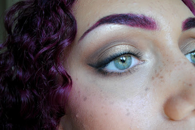 I used a bright blue on the lid, with a dark purple cut-crease fading up to my always-purple eyebrows, and a pale shimmery pink at the inner corners.